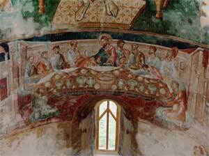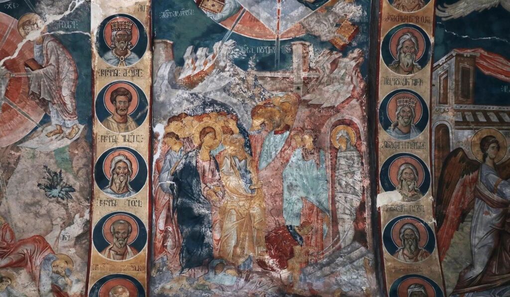 მონასტრის კედლები თორმეტი საუფლო დღესასწაულის შესახებ მოგიყვება. განსაკუთრებით გამოირჩევა საიდუმლო სერობისა და წმინდა გიორგის ფრესკები. როგორც მატიანე იუწყება, კედლის მხატვრობა იმ დროის გამოჩენილ მხატვარს დამიანესა და მის მოწაფეს გერასიმეს ეკუთვნით.