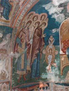 მრავალფიგურიანი კომპოზიციები, პილასტრების ერთიანი შევსება, სარკმლის წირთხლებისა თუ თაღის კუთხეებში ორნამენტული დეკორი, ბოლო რეგისტრის ფარდისებური მოტივი, რომელიც მთლიანად გასდევს კედლებს, ის დამახასიათებელი ნიშნებია, რომელიც უბისის კედლის მხატვრობაში გვხვდება. მთელს ეკლესიაზე გაბატონებულია კონქში გამოსახული ვედრების კომპოზიცია. ის თავისი მაშტაბურობით ტაძრის იდეურ და კომპოზიციურ ცენტრს წარმოადგენს. Eეს შთაბეჭდილება მიღწეულია საკონქო კომპოზიციის ვიზუალური გადიდებით. ვედრების სცენა მხოლოდ კონქს არ მოიცავს, ის მის ქუსლს ქვემოთაც საკმაოდ ჩამოდის. Aაქ დეისუსის გავრცობილი სახეა წარმოდგენილი. ტახტზე მჯდომი მაცხოვრის თავზე პირი ღვთისა გამოსახება. საკურთხევლის მომდევნო რეგისტრი სერობის კომპოზიციას ეთმობა_ ცენტრლური სცენა ტაბლასთან მსხდომ მაცხოვარსა და მის მოწაფეებს, ხოლო აქეთ-იქით პურითა და ღვინით ზიარებას. Mმესამე რეგისტრი წმ. Mმამათა რეგისტრია. რომელნიც გაშლილი გრაგნილებით ხელში ცენტრისაკენ (სარკმლისაკენ) მიემართებიან. სარკმლის წირთხლებში (რომელიც მამათა რეგისტრს ემთხვევა) გამოსახული ანგელოზნი სამწერობლებით ხელში კი უშუალოდ ამ საპროცესიო მსველობის წინამძღვრებად წარმოჩინდებიან.